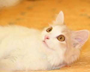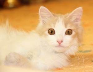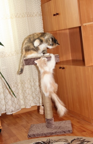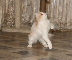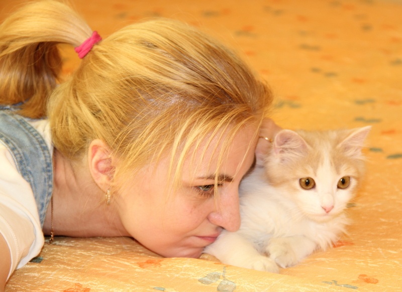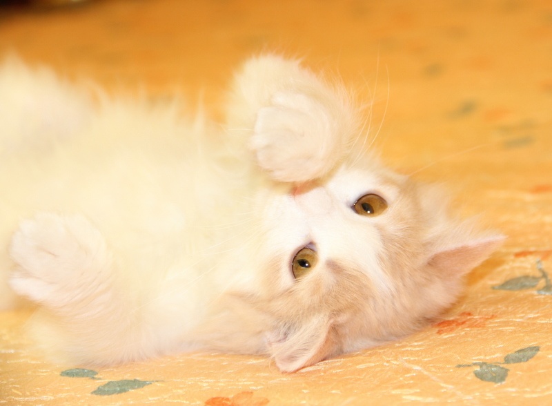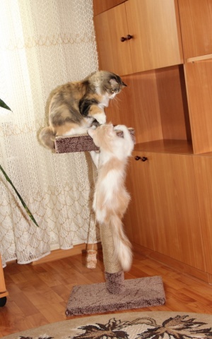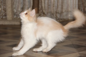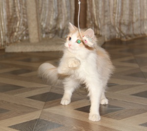 Обожает играть, может часами бегать с мячиком или мышкой, зато ночью крепко спит и никому не мешает. Очень любит ласку, если её погладить, она от удовольствия закрывает глазки и начинает тихонечко мурчать. Она совершенно не умеет мяукать, так что диким ором вас никто не разбудит)))