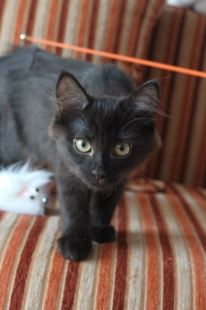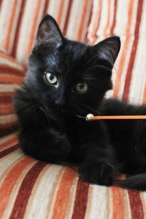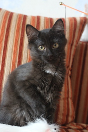 Элегантная малышка одета в маленькое черное платье с белым кулончиком на шее, имеет бойкий характер, очень умненькая и сообразительная. Девочке сейчас примерно 2,5-3 мес., проглистогонена, без промахов ходит в лоточек с наполнителем. Вырастет в невероятно красивую кошку.