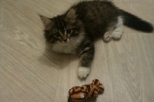 Норка очень игривая, веселая, прибегает ласкаться, как стихийное бедствие. Обрушивается ураганом, трется, хрюкает. Получив требуемую порцию ласки, уносится обратно - на окно птиц смотреть, скакать с игрушками по квартире, приставать к взрослым кошкам.