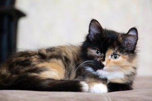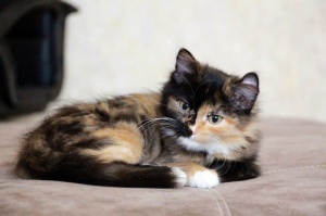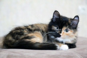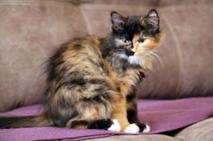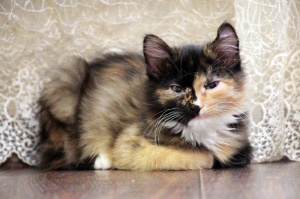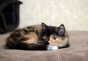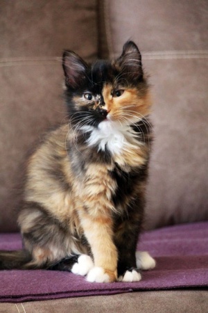 Очень красивая, яркая, душевная и очень спокойная девочка. Ее можно брать в семью, где есть другие животные. Будет пушистой, поэтому за шубкой нужно будет ухаживать.