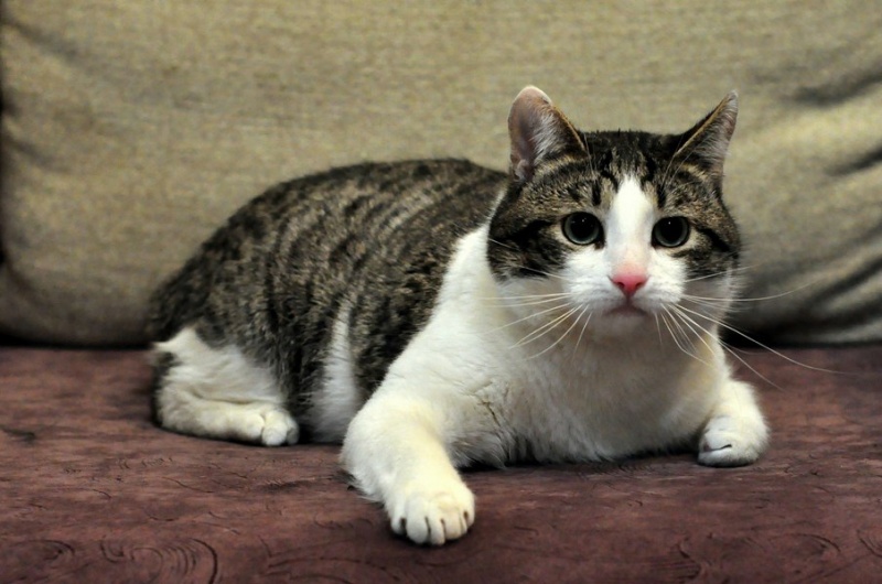 Этот котик был подобран на улице с сильно травмированным хвостом. Хвостик пришлось ампутировать, а в остальном кот здоровый, крепкий, сильный и жизнерадостный.