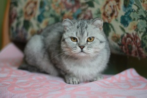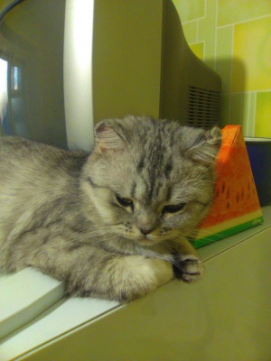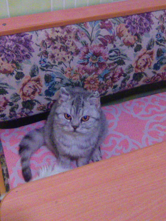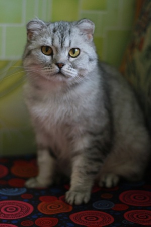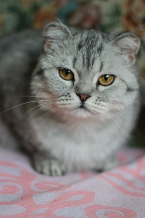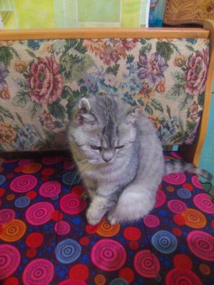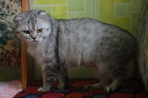 необычная внешность: серная шубка с тёмными полосочками, характерная "британская" корона на лбу и щекастая мордочка. Была найдена в сильные морозы с отмороженными ушками и хвостиком, поэтому пришлось ампутировать их кончики. Девочка очень дружелюбная и общительная, одинаково хорошо относится как к другим животным, так и к людям. Плюшка очень ласковая и нежная, любит, чтобы её гладили и чесали, но на ручках не сидит.