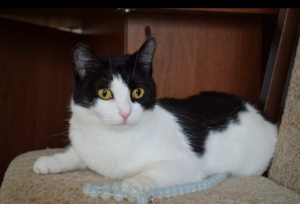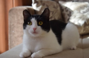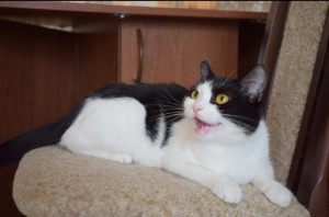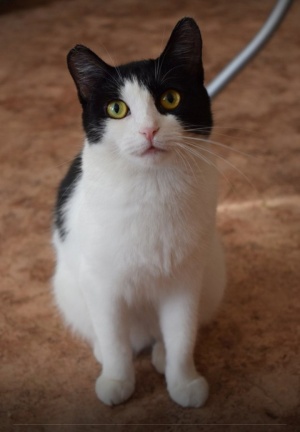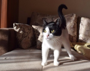 В пасхальные дни, кто-то из детворы обнаружил и приютил на лестничной площадке это чудо. Малышку забрали, отмыли, и оказалось, что это молоденькая худенькая кошечка. Назвали ее Тусей. Ее имя такое же нежное и кроткое, как ее обладательница.