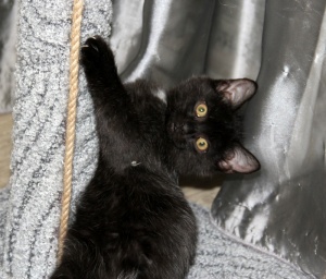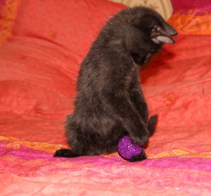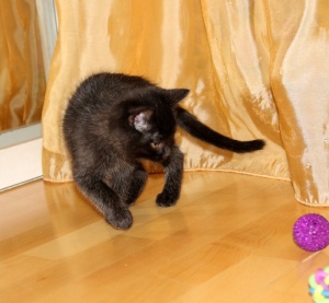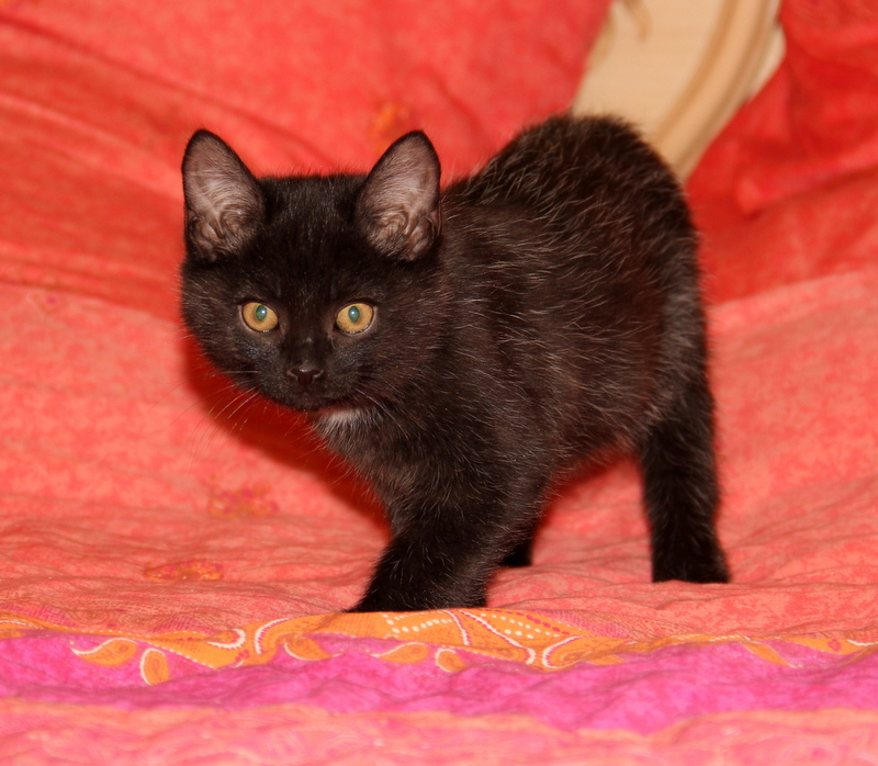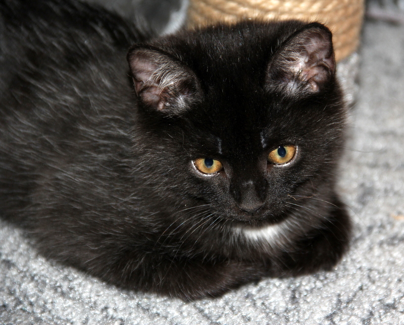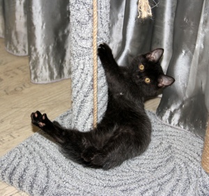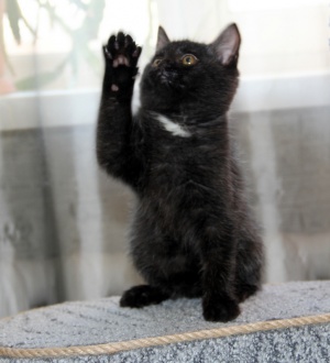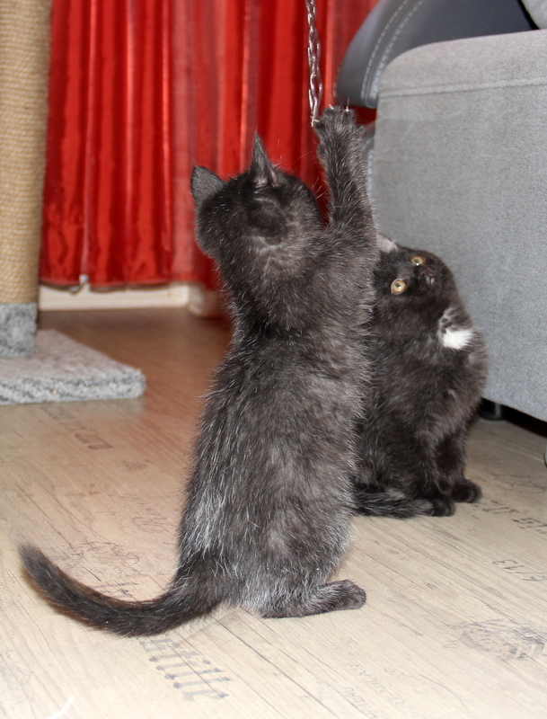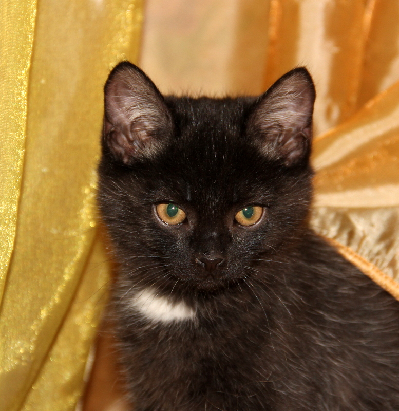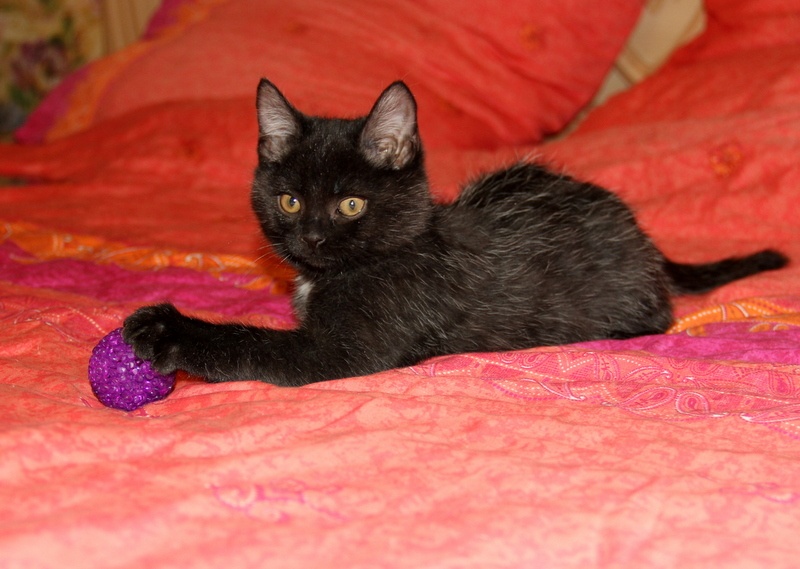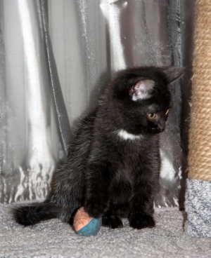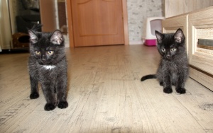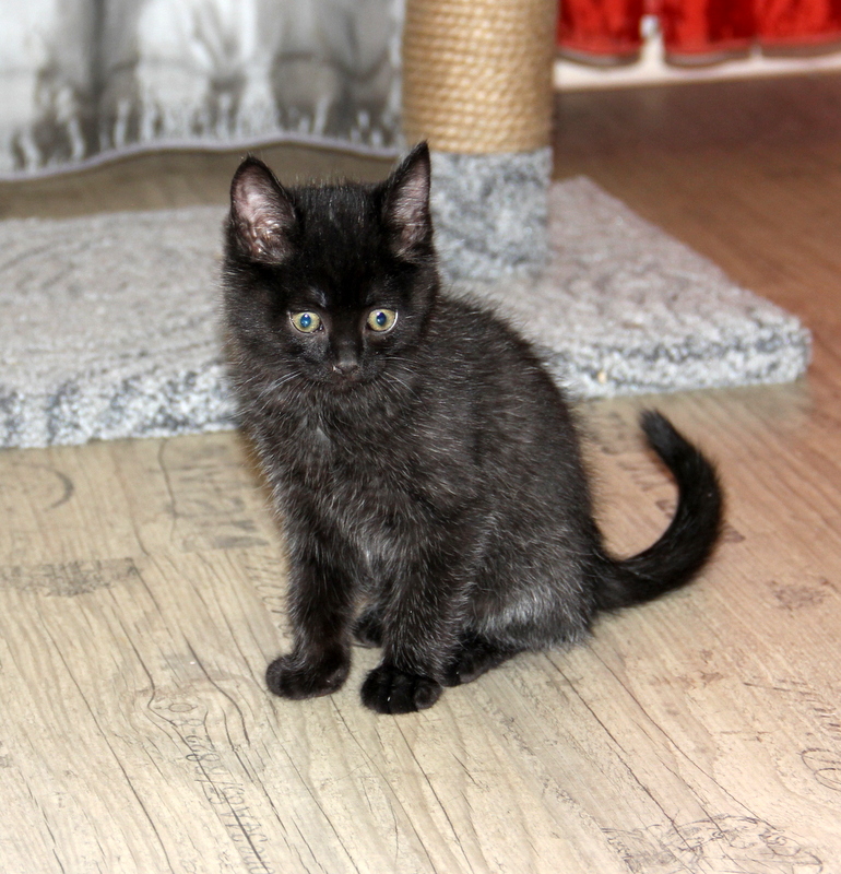 Один котёнок полностью чёрненький с серебристыми волосками по спинке.