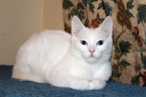 Снежинка обладает невероятного небесно-голубого цвета глазами. Она миниатюрнее, чем сестренка, а на головушке у Снежи природа оставила только одну серую отметину-крапинку.
