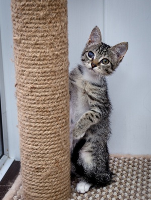 Хороший мальчик Уголёк, , который уже научился метко пользоваться лоточком, лазать по когтеточке, кушать сухой корм и играть-играть-играть!