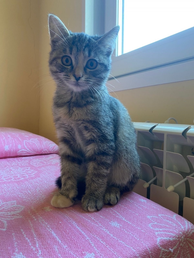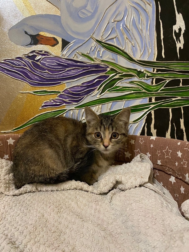 Соне сейчас примерно 2-3 месяца, она уже знает лоток, обработали от паразитов, намыли, обласкали, поцеловали и начали искать ей семью.