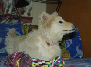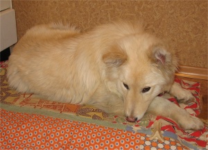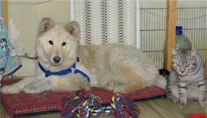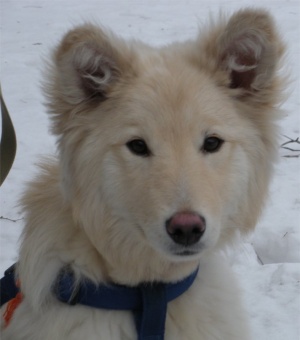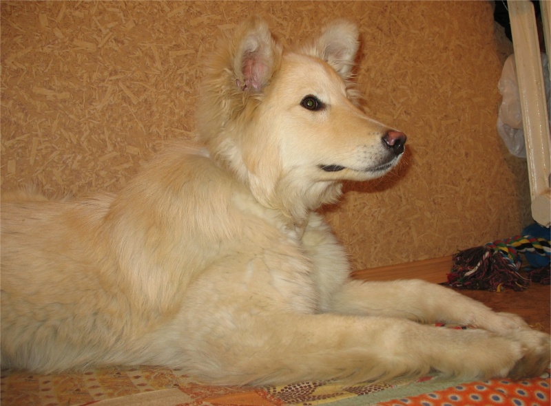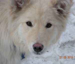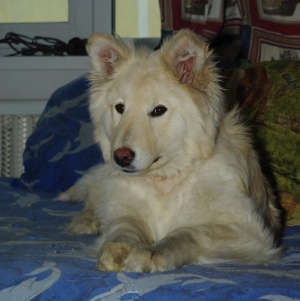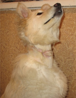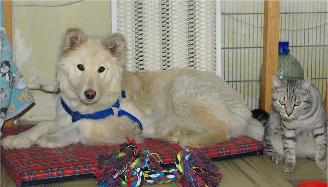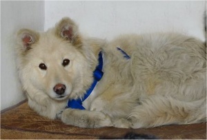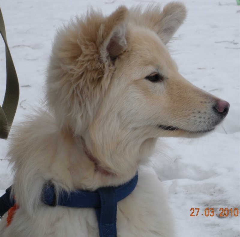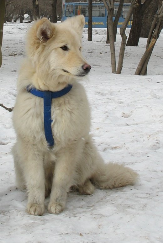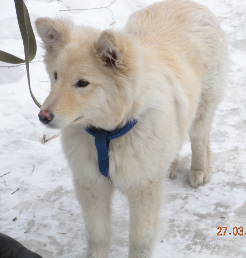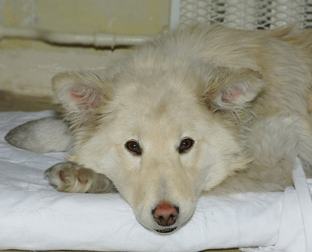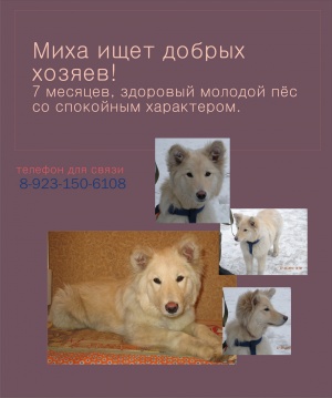 Осенью 2009 к церкви в НЕ прибежал маленький беленький щенок в ошейнике. Прихожане приносили малышу еду, малыш ел и рос, рос и ел, а ошейник в размерах не менялся. Малыша Мишку пытались выловить и снять ошейник, но увы, щен в руки не давался. Когда на белой мишкиной грудке появились кроваво-гнойные полосы, прихожане позвонили в наш приют и попросили о помощи. Два дня Галина Ильинична и Марина Павловна пытались поймать Мишку. Мишка, улыбаясь и виляя хвостом, подходил, приманку аккуратно съедал и молниеносно сбегал. Пришлось идти на риск и ловить с помощью "таблеток". Поймали. В ближайшей вет.клинике сняли часть ошейника. Пряжка вросла в мышцы, удалять железяку будут в клинике "Энималз" 10 марта в 12 часов.