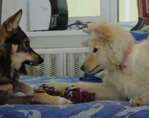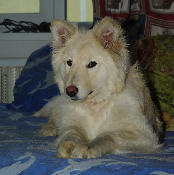 Все-таки Миха очень умный и понятливый пес, он ведь вспомнил навыки квартирной жизни. Теперь Миха три раза в день гуляет на улице, ведет себя достойно, собак он не боится. С людьми пока он осторожничает.