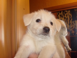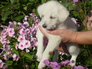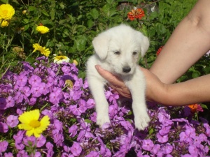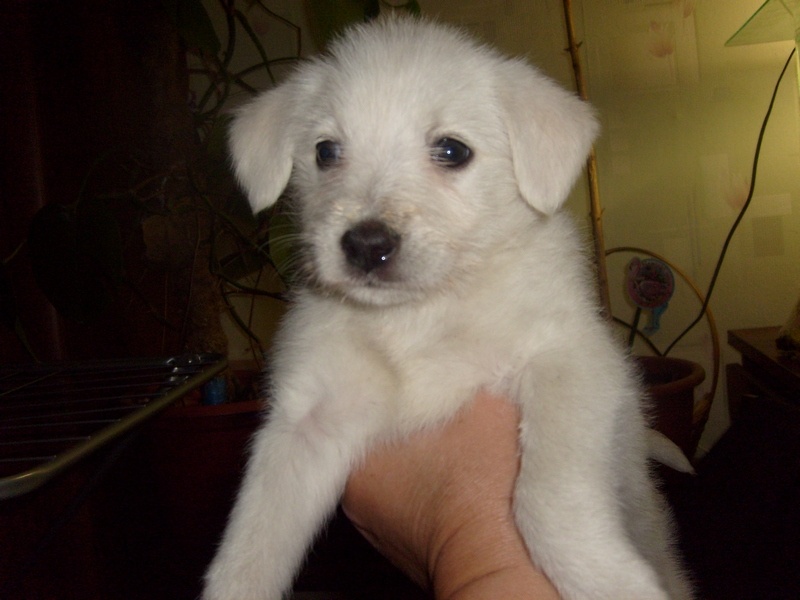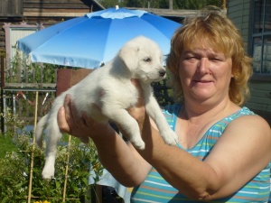 Сегодня вечером я, приехав с дачи на ст. Речной вокзал увидела что на проезжей части дороги бежит собака-мамочка , а за ней семенит маленький белый как "Ангел " щенок. Я бросилась за ними и уже почти на середине дороги подхватила этого щенка.Стояло много людей и наблюдали за происходящим. Я взяла эту малышку на руки и больше не смогла ее отпустить. Она издавала только нежное пописивание, а мамочка смотрела на меня глазами полными слез. Но...... оставлять щенка там было нельзя.Вокруг две скоростных магистрали и ж/д. И я стала уходить от собаки -мамы.Видимо собака поняла, что я хочу помочь спасти малышку и она меня не стала дальше сопровождать.Про это семейство я уже слышала, но до этого времени, собака-мама не выводила щенков из укрытия. Там было 3 щенка Вчера забрали 2 щенков и наверно собака бегала и искала их. Собака живет там уже несколько месяцев и ее там кормят местные продавцы. Щенок теперь у меня . Я ее помыла ,накормила и теперь будем искать хозяина. Это девочка,возраст 1 мес.,будет средней(40-45 см. высотой в холке) Папа у щенков тоже белый как и мама,только более пушистый.