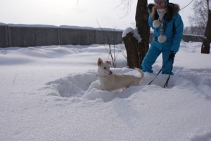 Белка радуется прекрасной погоде: купается в снегу, роет норки, пытаясь спрятать от меня свою палочку. Когда мы с ней играем, и я пытаюсь отобрать у Белки палочку, она так смешно на меня рычит, защищая свою собственность. Ух! Прям маленькая охранница.