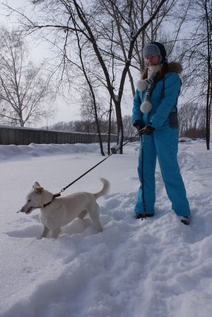 Радуется теплой погоде, с еще большим удовольствием гуляет, барахтается в пушистом снегу. Глядя на такую жизнерадостную и позитивную собачку у самой, несмотря на зимний авитаминоз, резко улучшается настроение.