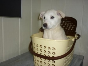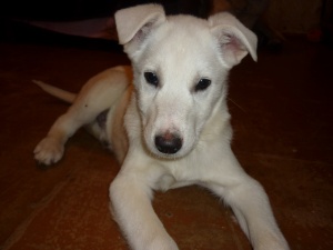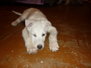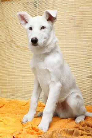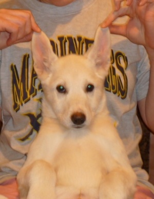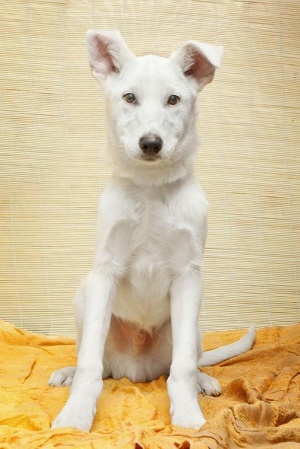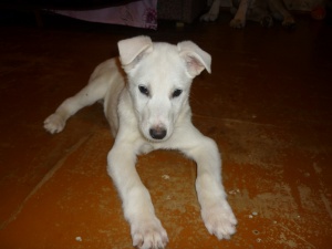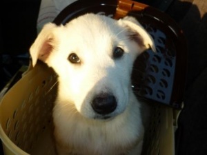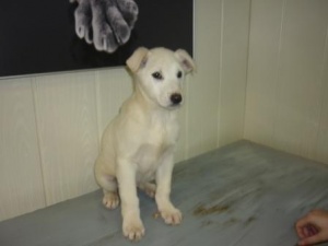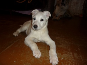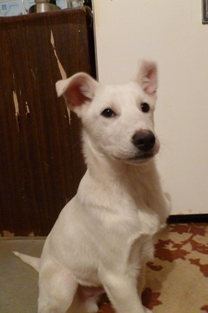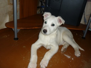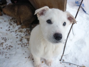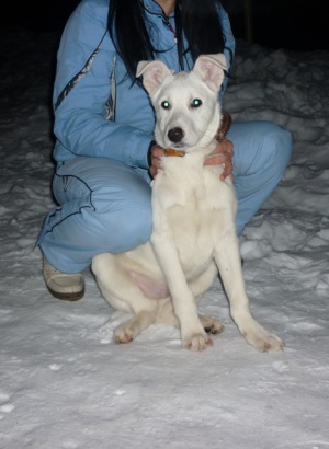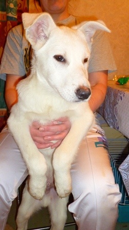 12.12.2010 морозным утром я,уежая по кото-песьим делам ,увидела собаку,сидящую посредине трамвайных путей.Лаяла она периодически в сторону огороженной территории стройки.Как-будто звала людей туда.На обратном пути мы подругой не могли не зайти на стройку для разведки обстановки..На территории протоптаны тропинки и мы,взяв след, гуськом пошли по проложенному кем-то маршруту.Навстречу нам бежал повизгивая,поскуливая,подпрыгивая от холода белоснежный щенок!Камуфляж соответствовал зиме,выдавали на белом снегу только черные глазенки!Малыш метался и не знал,то ли радоваться нам,то ли хвост в лапы и восвояси..Щеночек дрожал от холода-шерстка коротенькая.Дали каши(заранее подготовились),слопал с таким щенячьим причмокиванием,только уши хлопали )))Потом он побежал вглубь по тропинке, мы за ним.Из будки посыпались как горох щенки-колобочки 7 хвостиков,в два раза меньше его.Вот об них-то он и грелся или они об него.Глядя на этого ангелочка ,наше с подругой чутье не подвело:его будущий хозяин уже ищет его здесь!!!Мы малыша в корзинку(филейная часть с трудом протиснулась) и в "Атлант".Там нам поставили сыворотку ,осмотрели-новенький здоров(ттт)!Сейчас он в заботливых руках,ждет своего хозяна.БИМ-активный,не злобный,игривый пес!Станет верным другом и компаньоном!В ветклинике нашли его очень схожим с ЛАБРАДОРОМ,а еще один опытный собаковод увидела в нем ШВЕЙЦАРСКУЮ ОВЧАРКУ!Вот такие мы!А то,что БИМ белый-очень символично в преддверии Нового года!!!