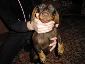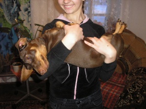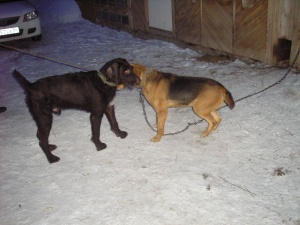Прежние хозяева за прошедшее время к нам не обратились, поэтому отвезли его на новое место жительства в п. Дорогино. Попробуем ужиться в небольшом новом коллективе сородичей-охотников: таксочка и два гончака. Из укромного места за этим будет наблюдать ещё и кошка.