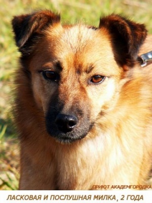 Солнечная Милка - ласковая жизнерадостная собачка. Милке около пяти лет, в холке она около 35-40 см. Она быстро привыкает к новой обстановке, хорошо уживается с дружелюбными кошками и собаками, спокойно остаётся дома одна, чистоплотная и аккуратная, с удовольствием гуляет (на поводке или на рулетке), спокойная и ненавязчивая.
