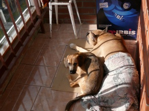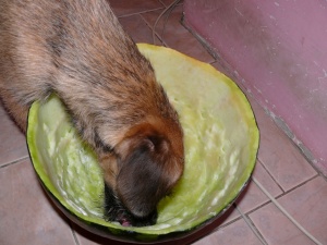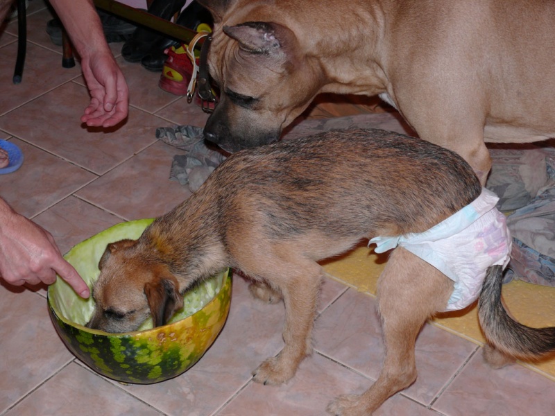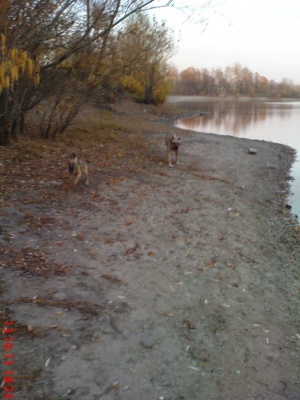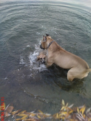 Вилюша мой зашёл попить и охладиться, каково же было моё удивление, когда Одри, как лягушка, без разбега прыгнула в воду, испугалась и поплыла к берегу, а Вилька ринулся к ней, наверно, хотел помочь. Как раз фото внизу и иллюстрирует всю эту ситуацию.