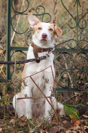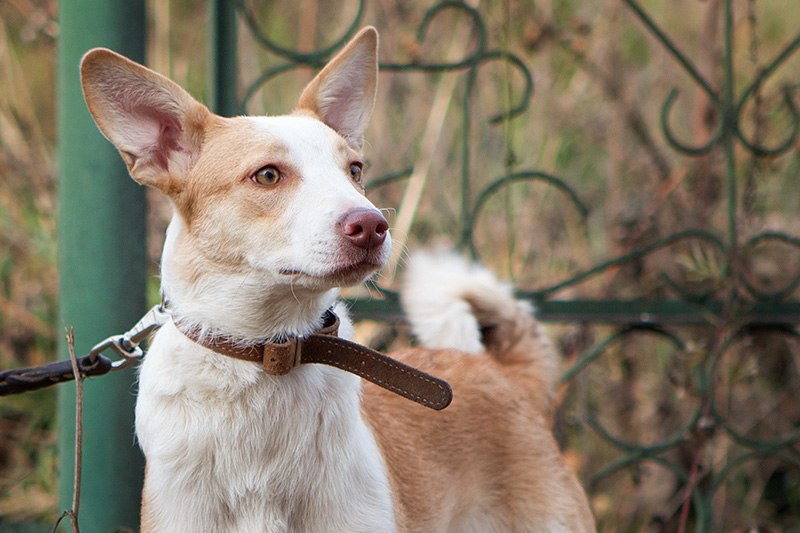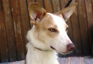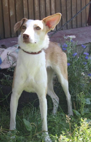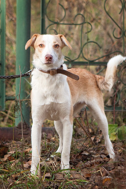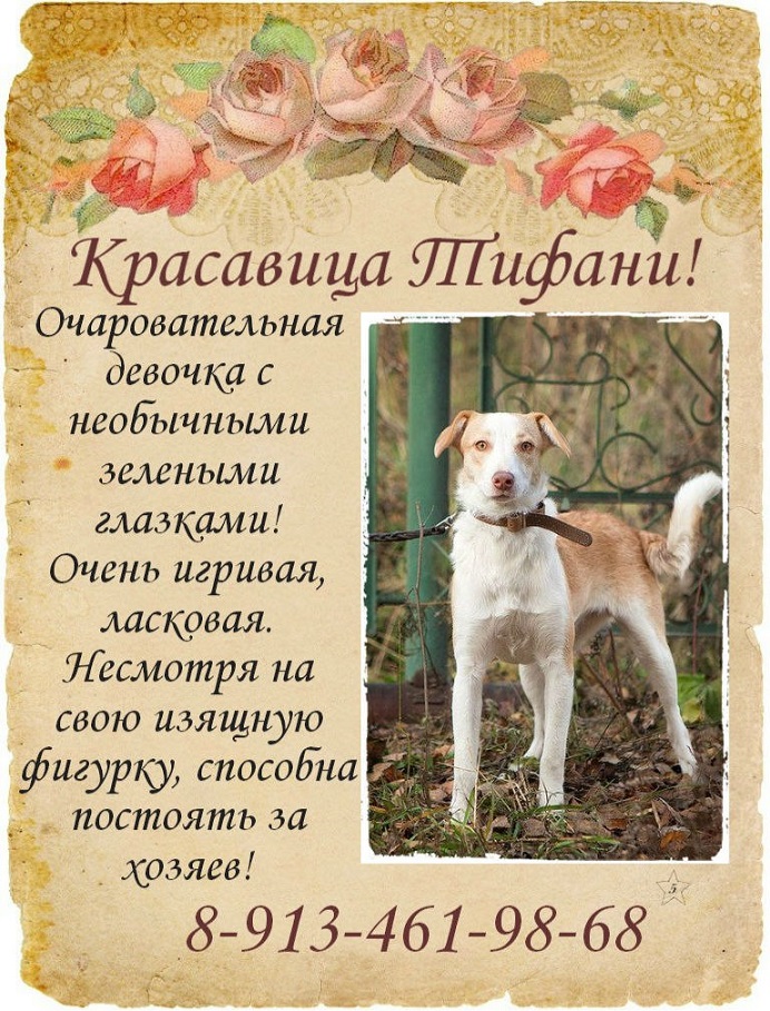 Тифани около 11 месяцев. Она изящная, бело-рыжая собачка с красивыми зелеными глазами