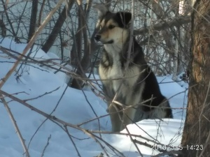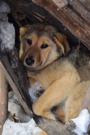Лисичка - рыжая, с умной длинной мордашкой, на фото она слегка напугана (слишком много народу собралось поблизости), в спокойном состоянии Лисичка - наблюдатель, с хитрой улыбкой присматривает за приехавшим кормить щенят человеком, принюхивается и одобрительно кивает, учуяв кашку с мяском));