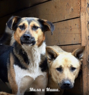 Такие разные и такие похожие. Оба с открытым сердцем, готовые любить и помогать. Миша защищает Милу, греет ее, подсовывает вкусную косточку, Мила отвечает ему глубокой благодарностью, сопутствуя во всех его делах, выслушивая его ворчание и отвечая на его ласки. Этих собак нельзя разлучать, потому что они не смогут жить друг без друга. Они просто погибнут от тоски так же как лебедь умирает, потеряв свою любимую. Мы уважаем их чувства, поэтому хотим пристроить их вдвоем в одни добрые руки.