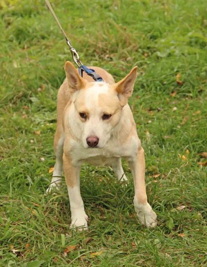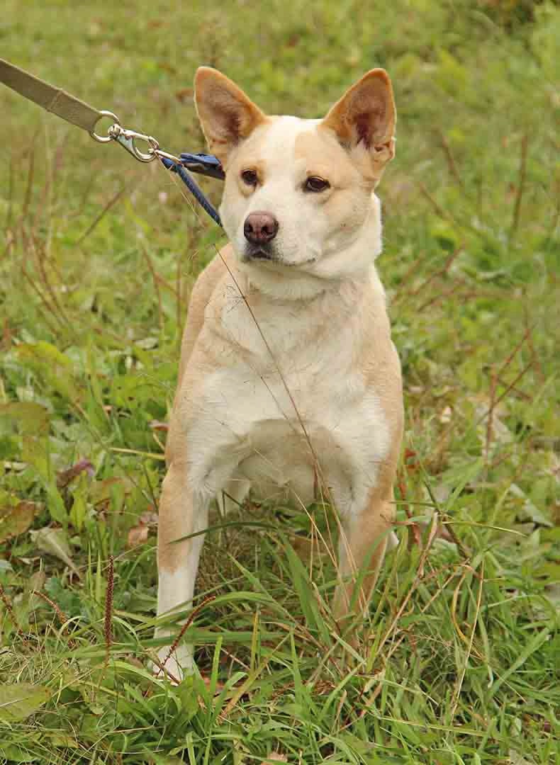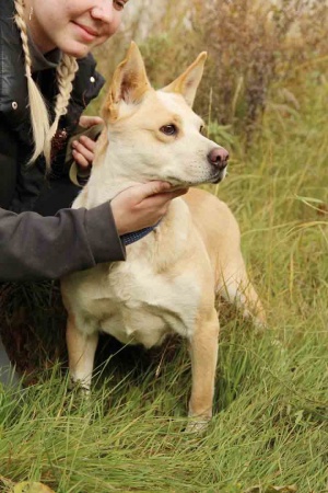 Панни небольшого размера, ростом ниже колена, знает поводок, с удовольствие ходит на прогулку. Сейчас она живёт в вольере и очень радуется, когда её выводят погулять.