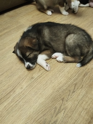 Один мальчик (на первом фото) и три девочки. Мать похожа на западно-сибирскую лайку, очень умная. Мать-подобрашка, уже стерилизовали. Теперь срочно нужно пристроить щенков, так как семейка живёт у пожилой пары, людям тяжело содержать такое количество живности.