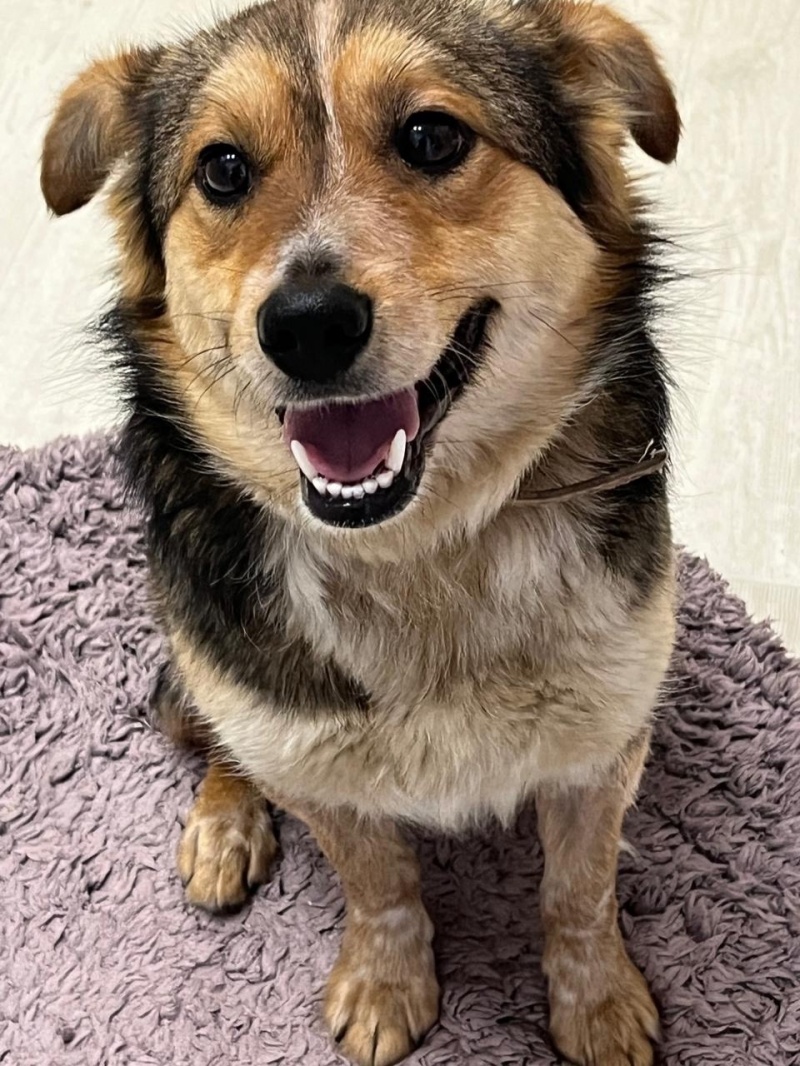Этого улыбчивого, дружелюбного пёсика зовут Малышок. Он в правда очень маленький, весит 10 кг